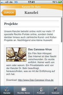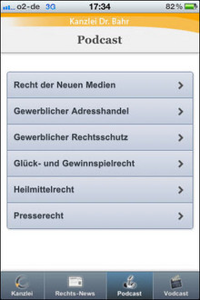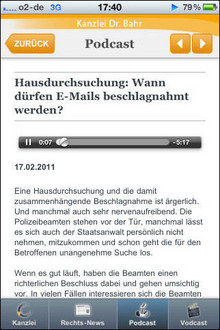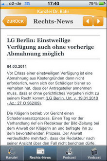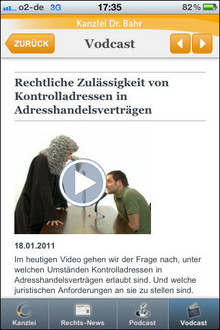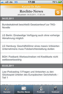 Aus technischen Gründen bieten wir ab sofort den Download der App im Store nicht mehr an. Bereits installierte Apps funktionieren unbegrenzt weiter. Da wir seit langem unsere Webseiten im responsiven Design anbieten, können Sie unsere News-Seiten im Browser Ihrer Wahl auf dem Endgerät Ihrer Wahl (Smartphone, Tablet u.a.) anschauen. Zudem können Sie unseren News-Feed als RSS beziehen oder unseren Twitter-Account abonnieren.Unsere iPhone-App liefert Ihnen tägliche top-aktuelle News und Gerichtsentscheidungen aus den Bereichen Neue Medien, Marken-, Wettbewerbs- und Urheberrecht sowie Datenschutz und Glücks- und Gewinnspielrecht. Besonderes Feature: Hochwertige Videos und Podcasts machen die teilweise komplizierten Zusammenhänge einfach verständlich. Bekannte Stimmen wie die Sprecherin der Spiegel-TV--Beiträge sind ein zusätzlicher Anreiz.